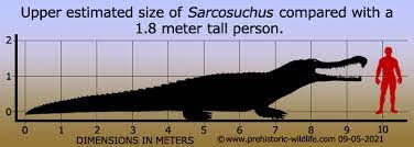 Sarcosuchus,one of the largest crocodile in history.Live during 110 million years ago in North Africa,the early cretaceous period.Average length is about 31 feet,or 9.5 meters.Some large indivisuals could even reach up to 40 feet,12.2 meters in terms of length.Weight about 4 to 6 tons,up to 8 tons.It's name meaning flesh crocodile.Sarco means flesh in Greek,Suchus or Sochus means crocodile in Greek.Similiar to modern crocodiles,it camouflage on water surface as a punk or wood,when dinosaurs or other animals drinking water.Sarcosuchus then jump out and capture that dinosaur and drown it.Note:Sarcosuchus can't do death roll like saltwater crocodile,because it's jaw is too thin to do it trick.But it's has a really hard shell plate on it's back or resistance and protection luckily.Even large carnivore dinosaurs are struggle to damage it.